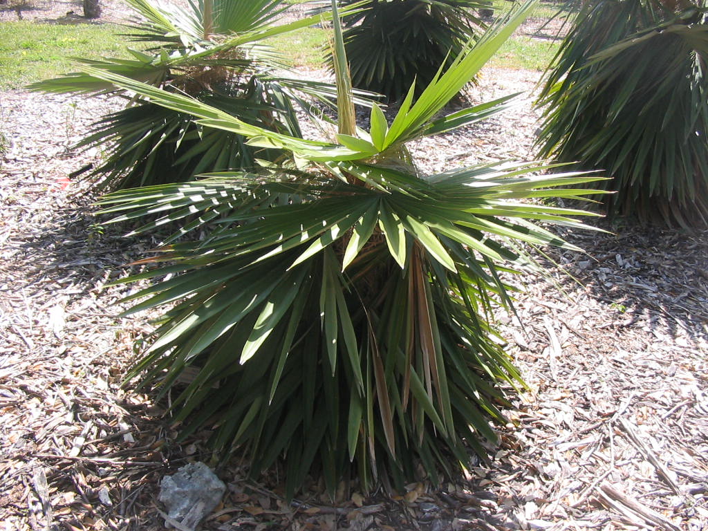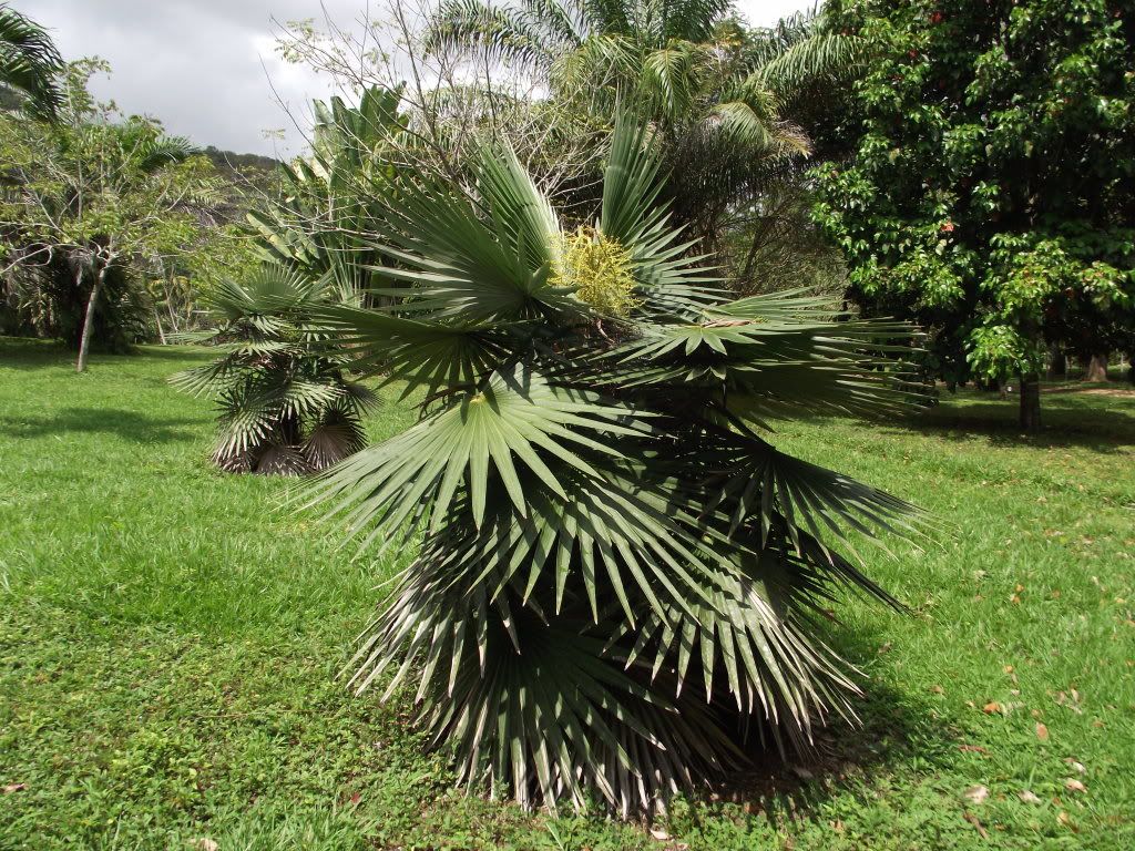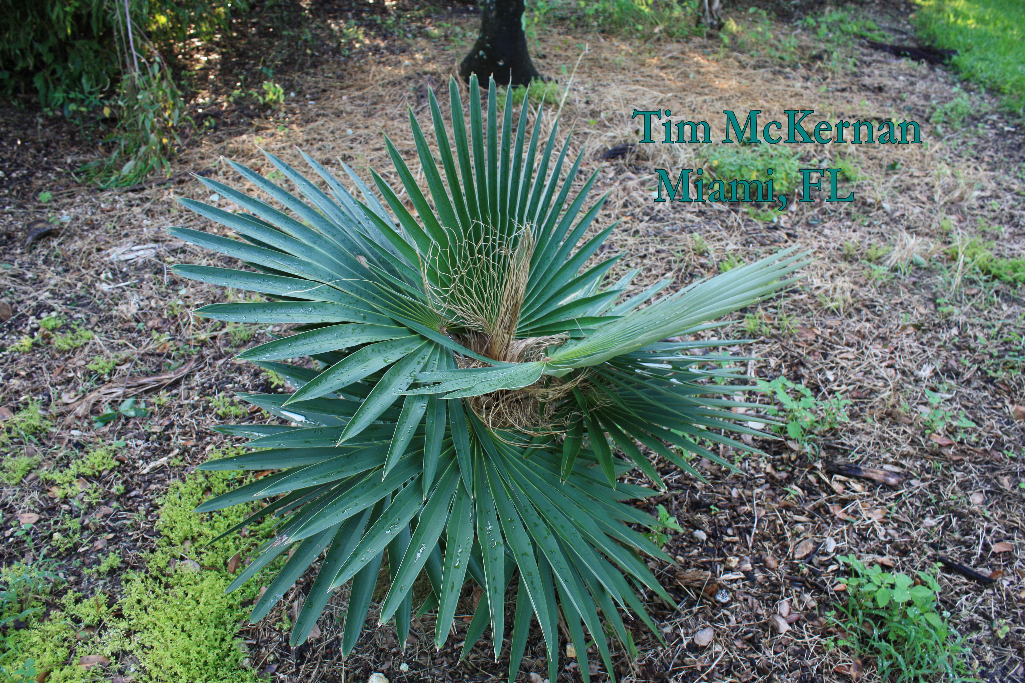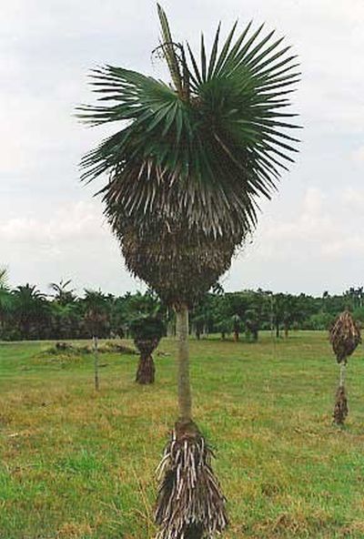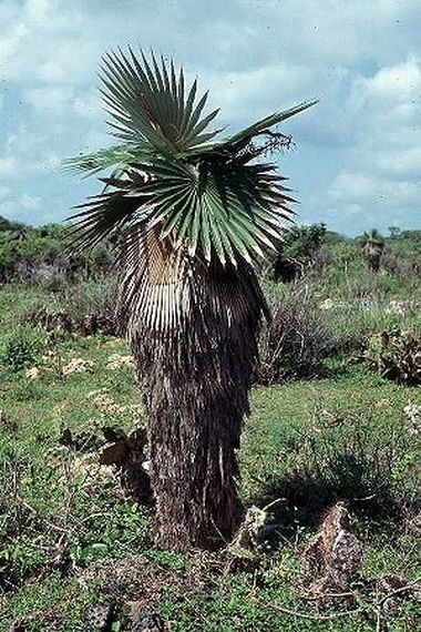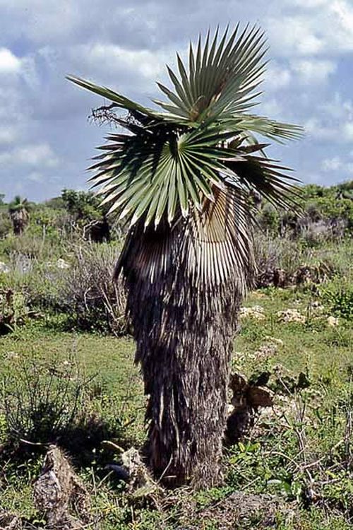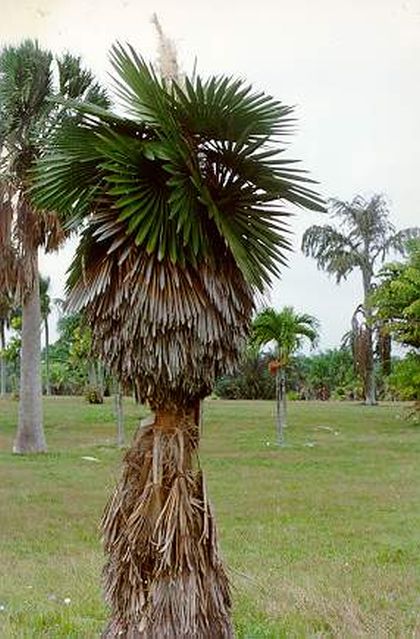 Conservation Status: Seriously endangered. Trunk type: Solitary. Leaf detail: Palmately compound. A small to medium sized palm, with a slender trunk, which is covered in a fibrous "cloth". It has a crown of closely spaced, thick, rigid, leathery, circular, dark green leaves, which are on short petioles.
