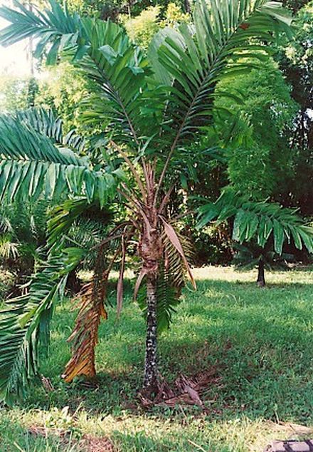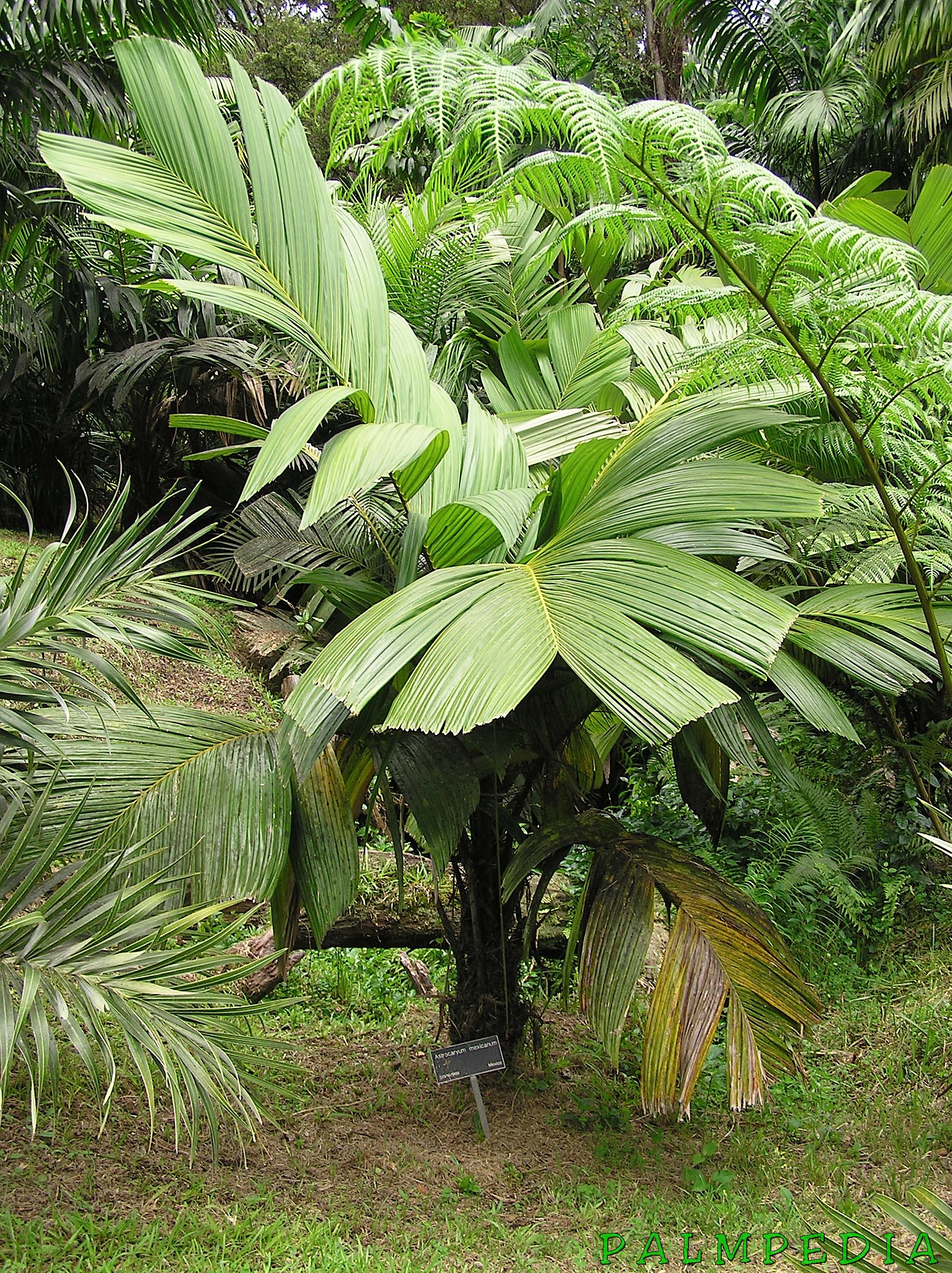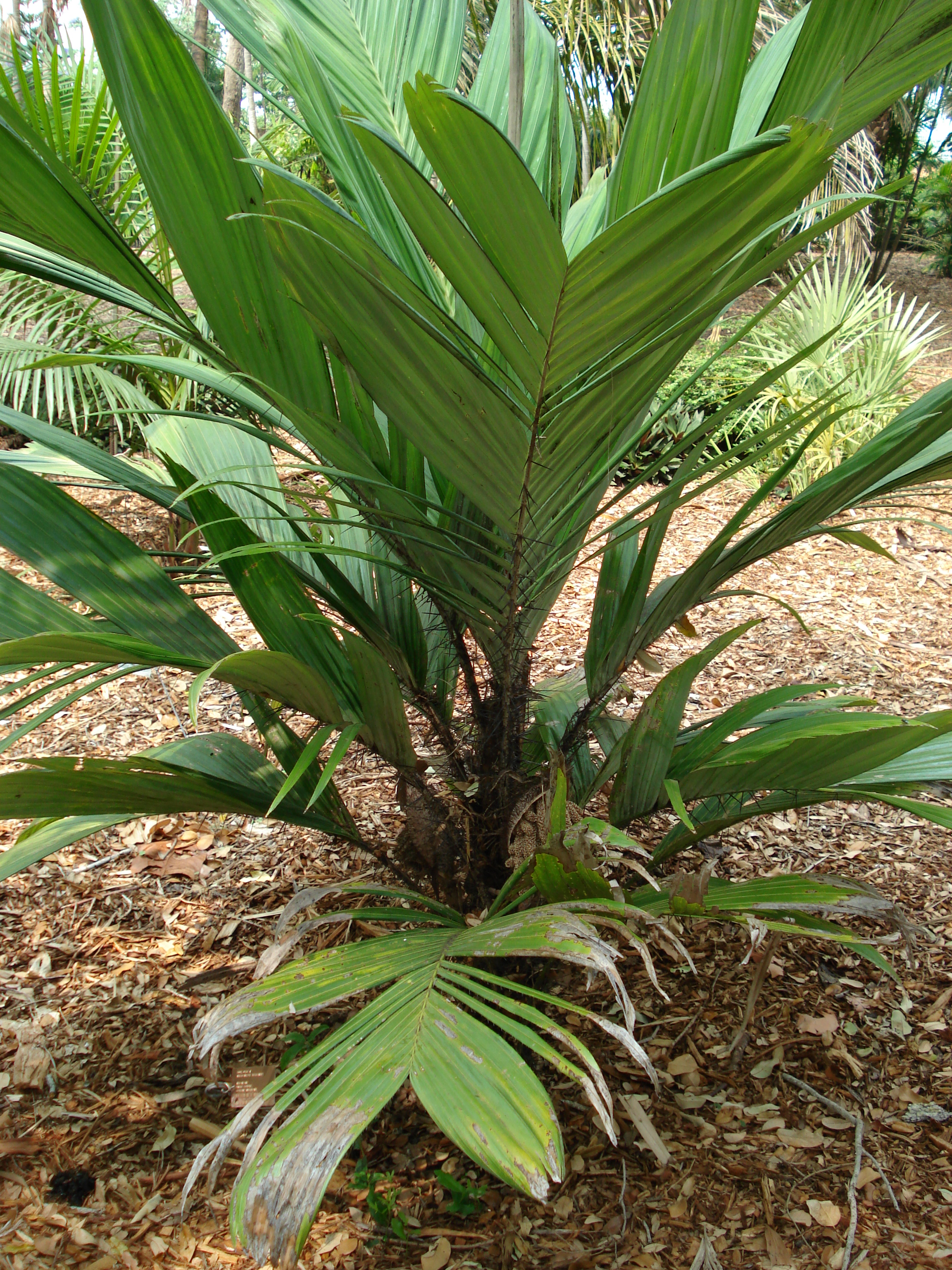 A smaller growing palm to about 2.5 m with heavily spined, trunk, petioles, and rhachis, Even the flower spathe has spines, It has large, simple, or sparingly divided leaves. Leaflets are dark green above, and silvery underneath. Requirements: Light shade to full sun, Exists from the tropics to the sub-tropics, but is most common in Central America.