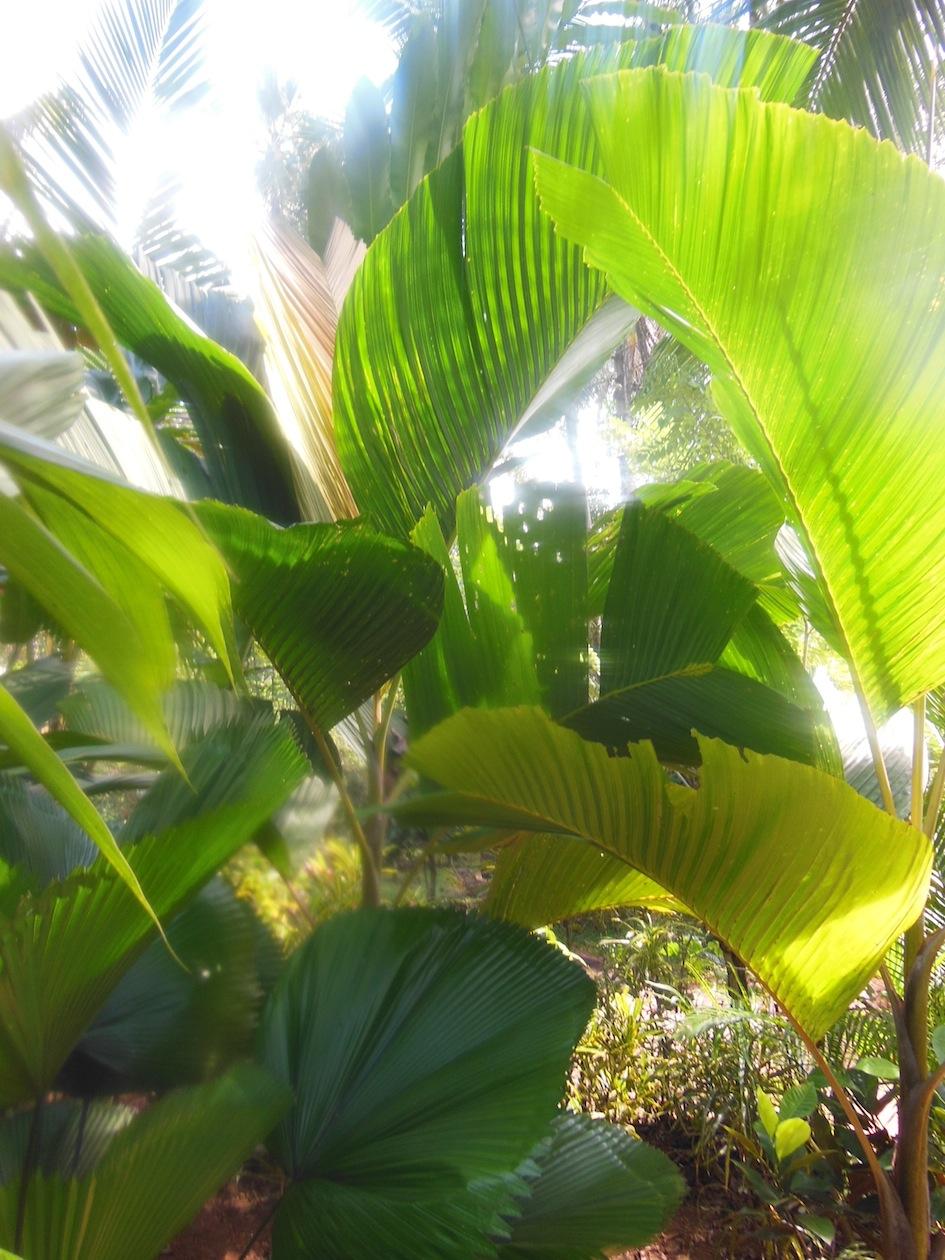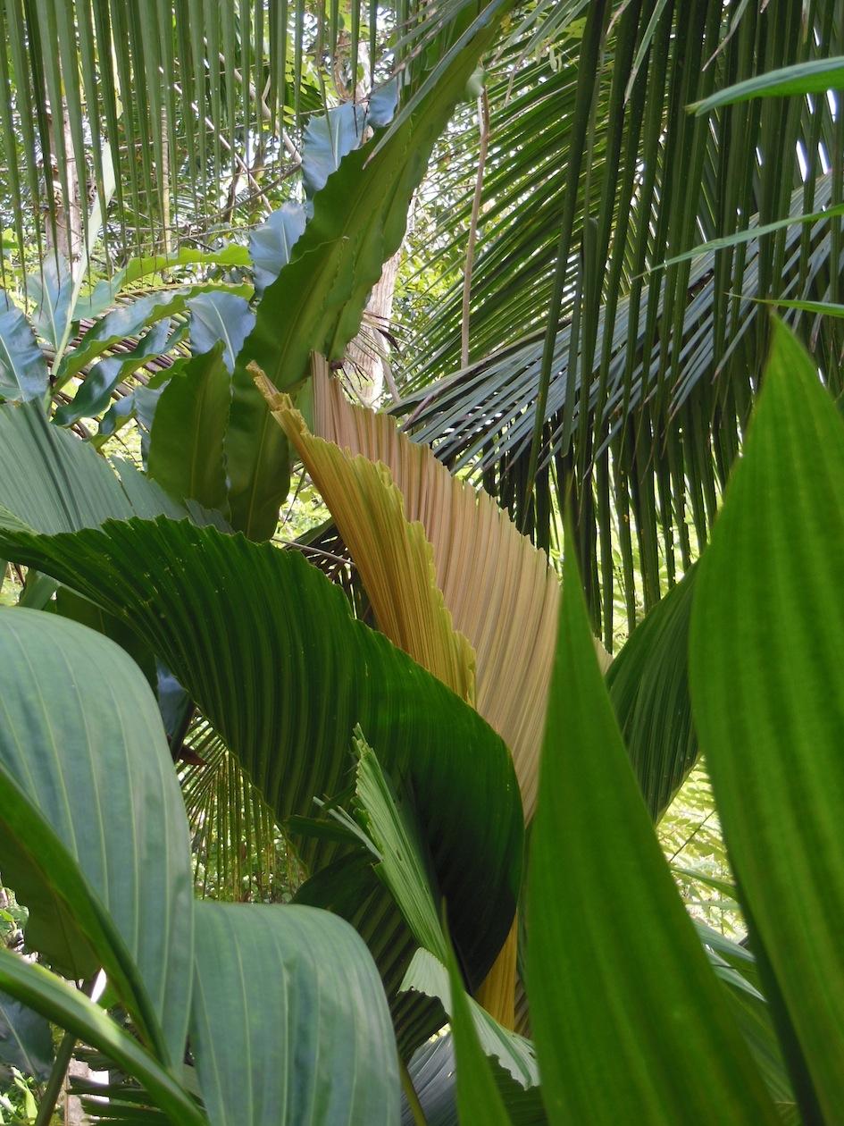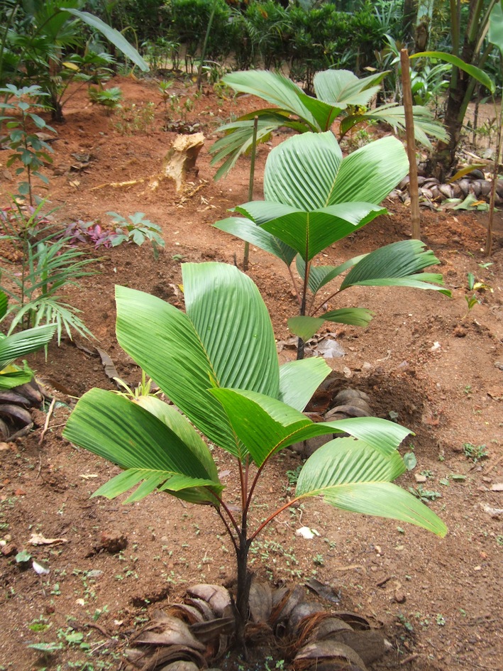 The distinguishing feature of this palm from the Seychelles, is the stilt roots supporting the slender stem. The leaves split along the margins irregularly with age, and may appear pinnate. The dark brown fruit that are produced on hanging infructescences are 2-3 cm long. (James Cook University)